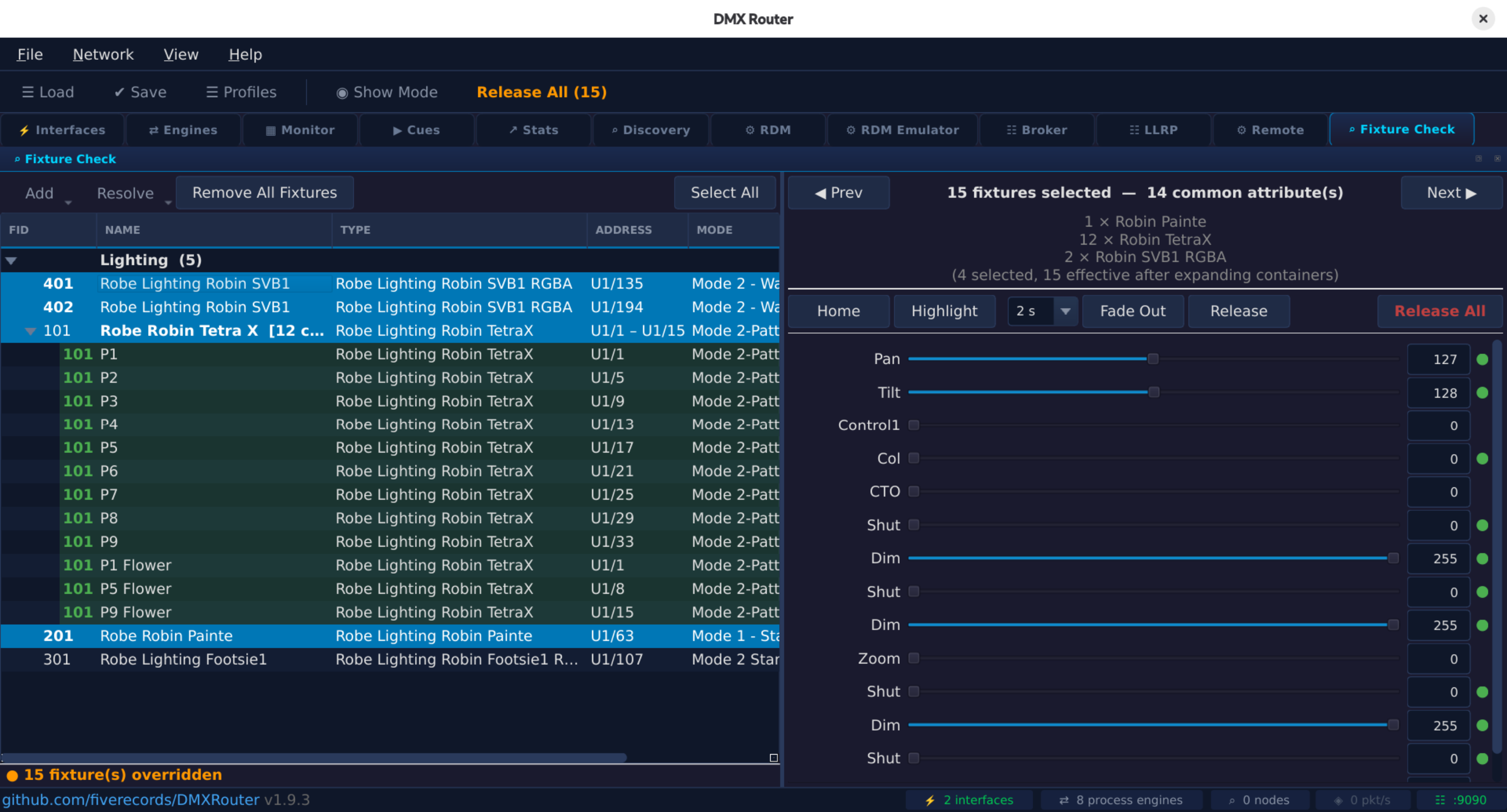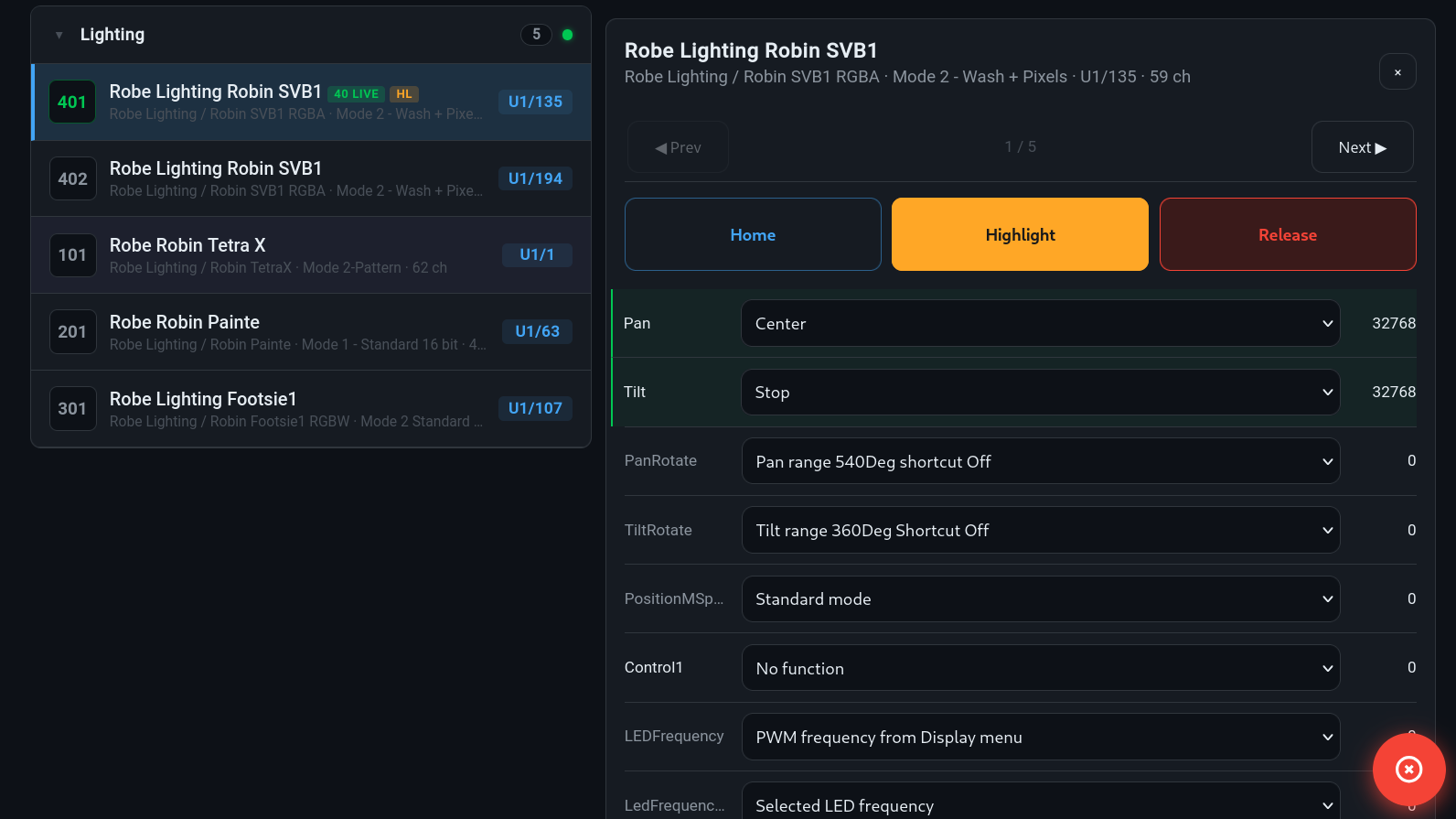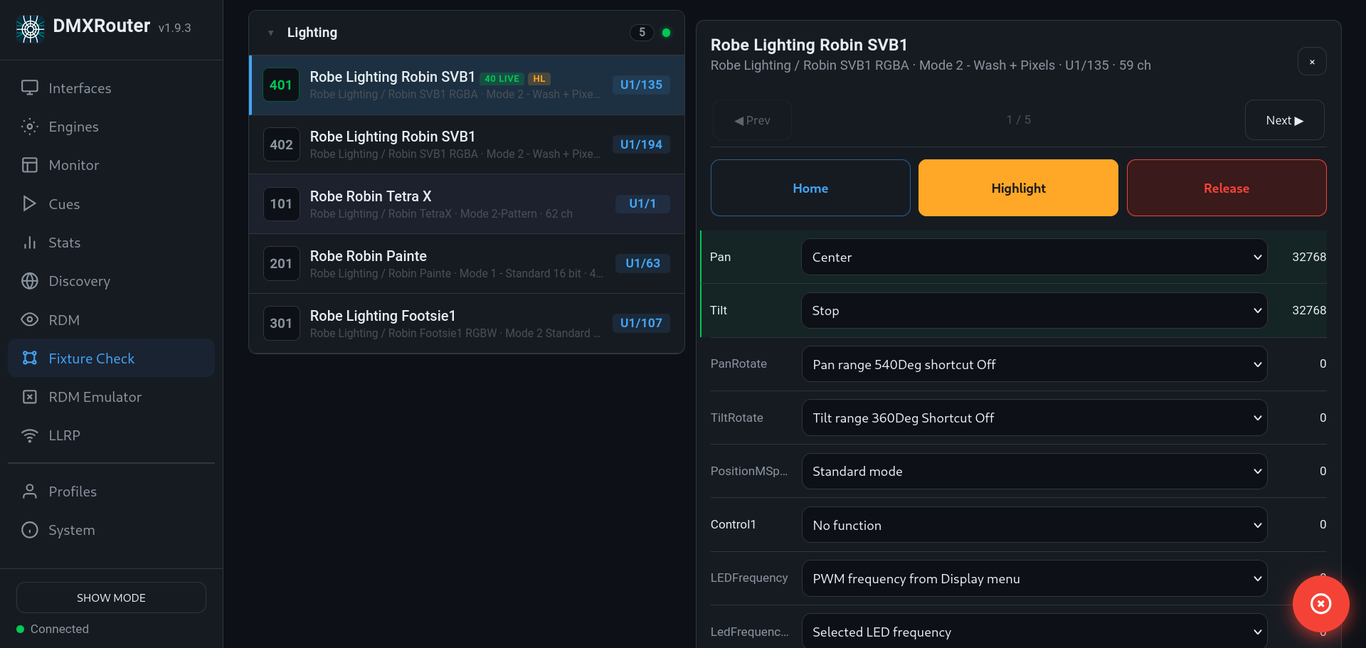 Once fixtures are loaded, DMXRouter makes testing and setup straightforward. A dedicated Fixture Check view lets you control parameters like dimmer, pan, tilt, or color using clearly labeled controls. You can quickly highlight fixtures, reset them to defaults, or release them-making it ideal for commissioning and troubleshooting.