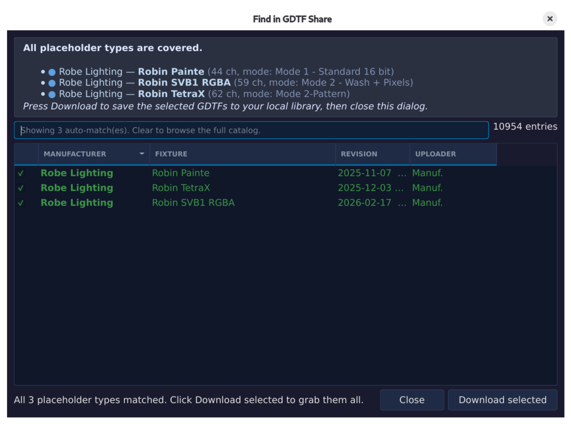 Placeholder fixtures are no longer a headache. The app can automatically detect generic fixtures and replace them with accurate GDTF profiles from manufacturers. With built-in GDTF Share integration, finding and downloading the correct fixture data takes just a few clicks.
